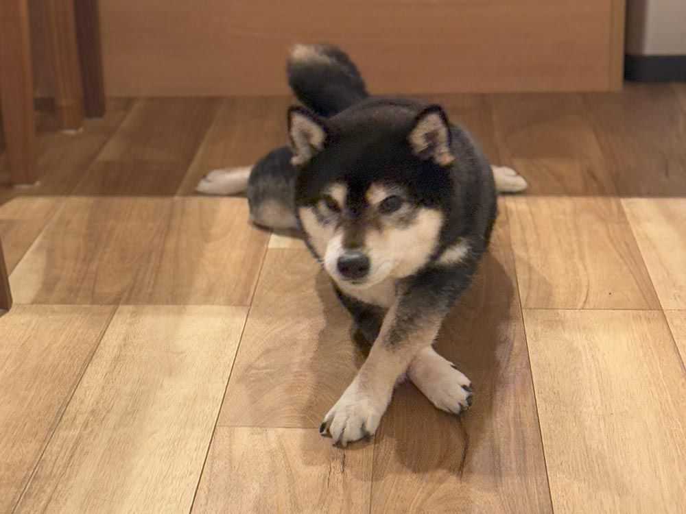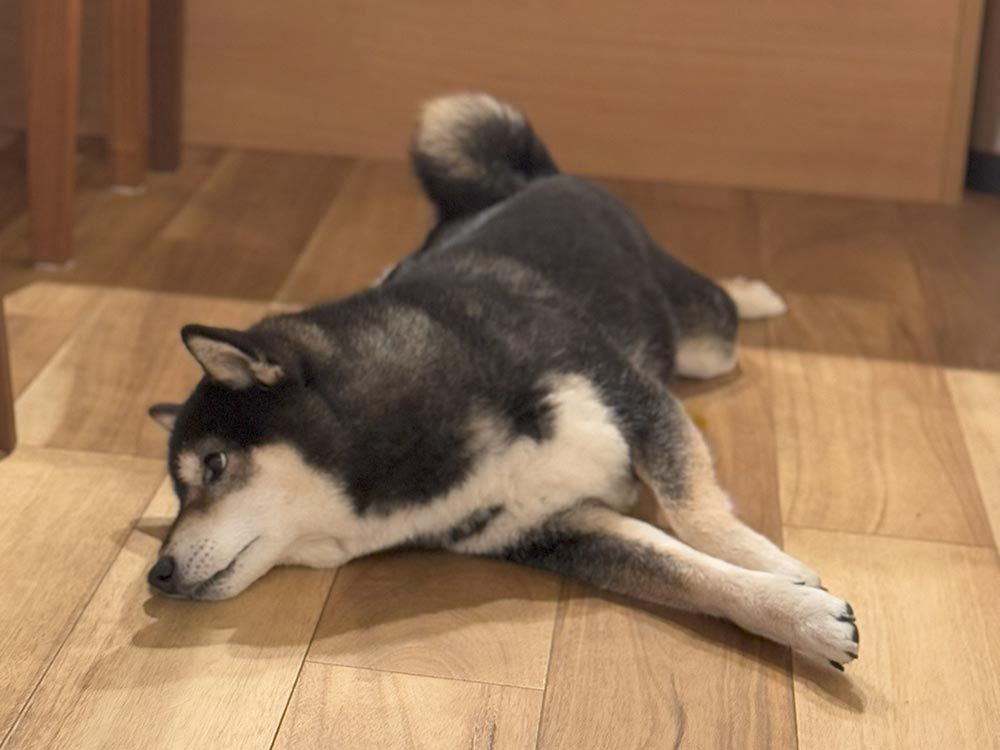 突然表情が乏しくなり、しっぽが下がり、動かなくなる(というより、動けない様子)。しばらくして伏せの体制になるも、スローペースでなんだかとてもおかしい。